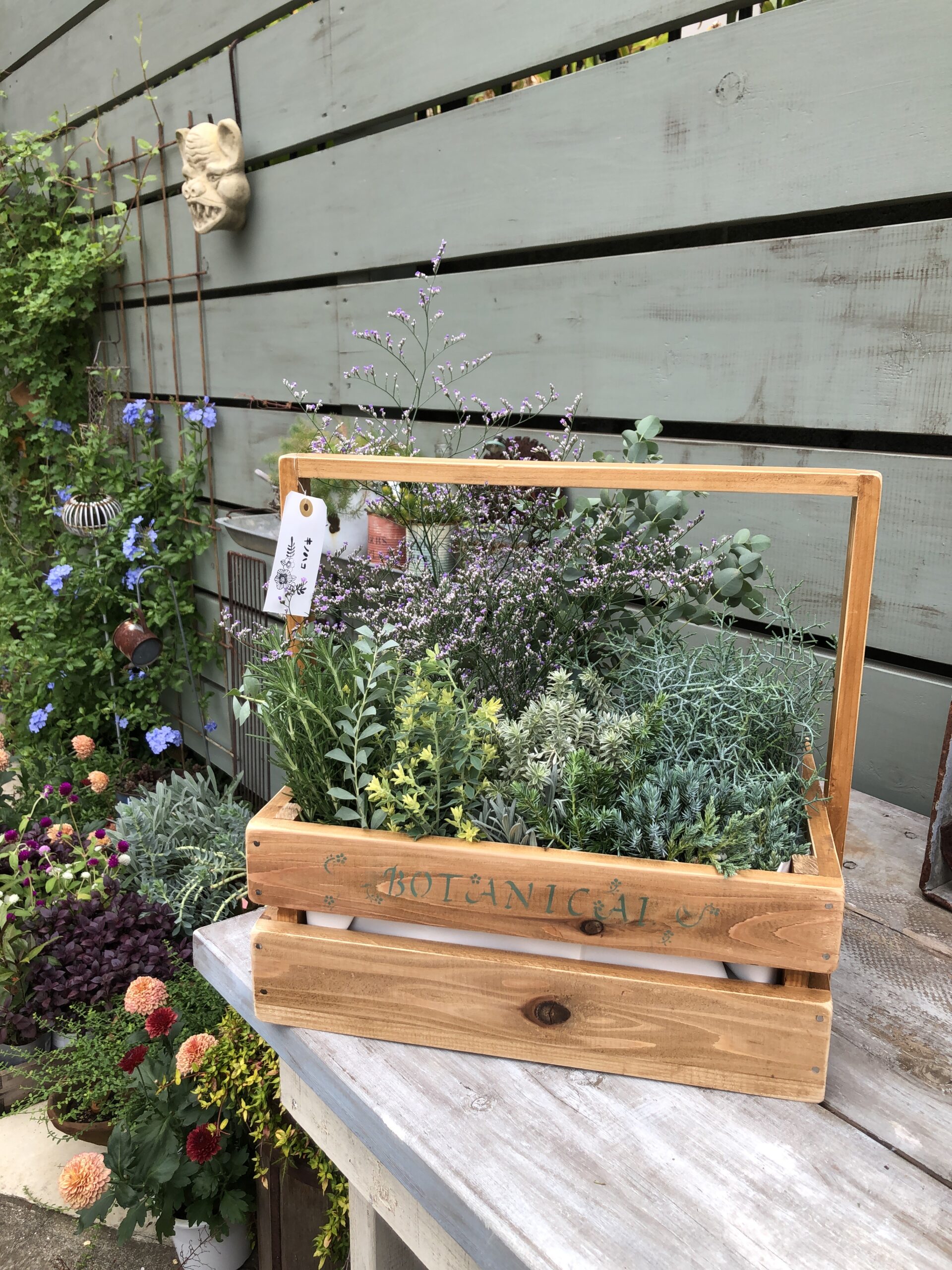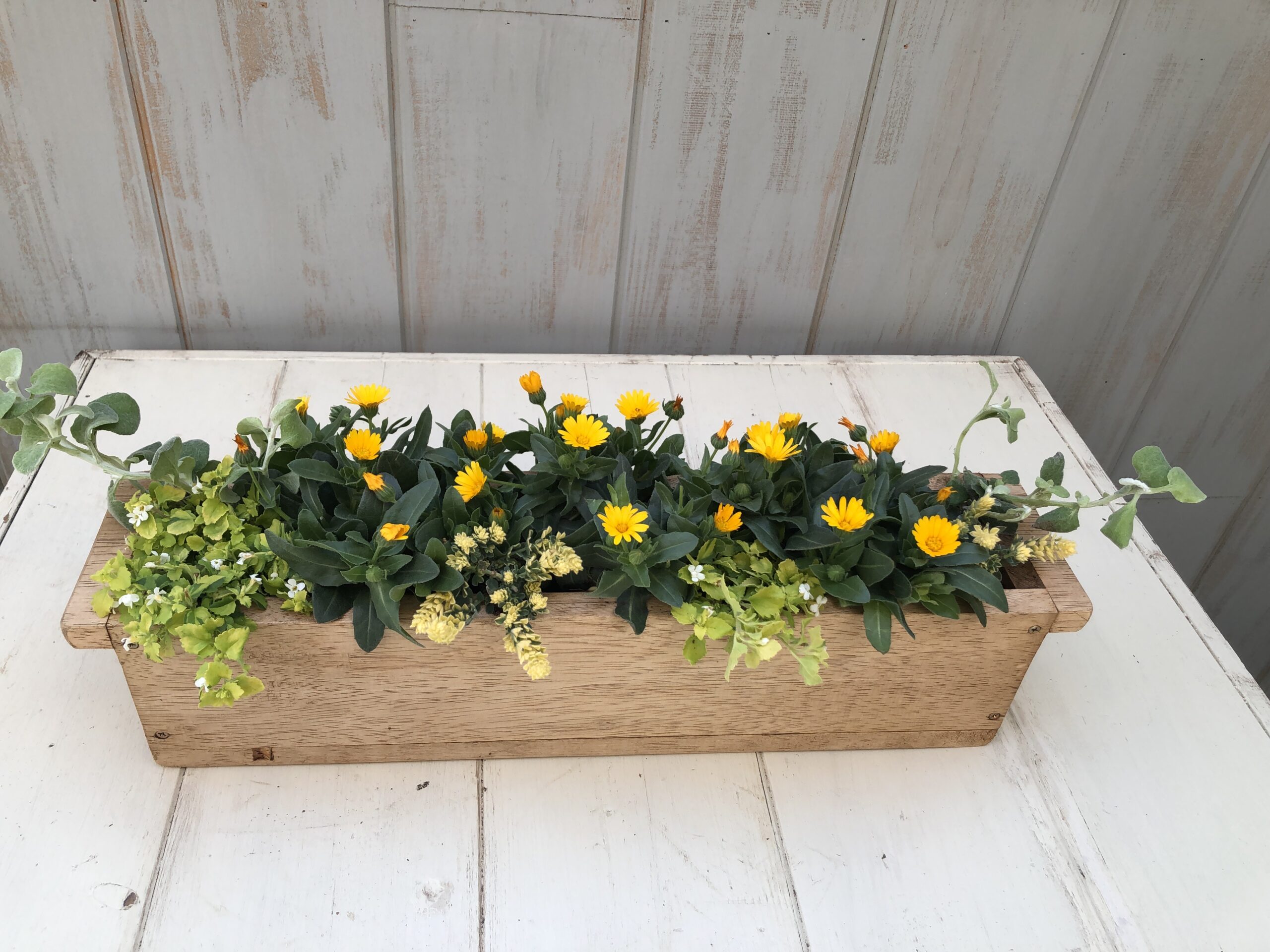 花苗や多肉植物を引き立てる雰囲気のあるウッドプランター。