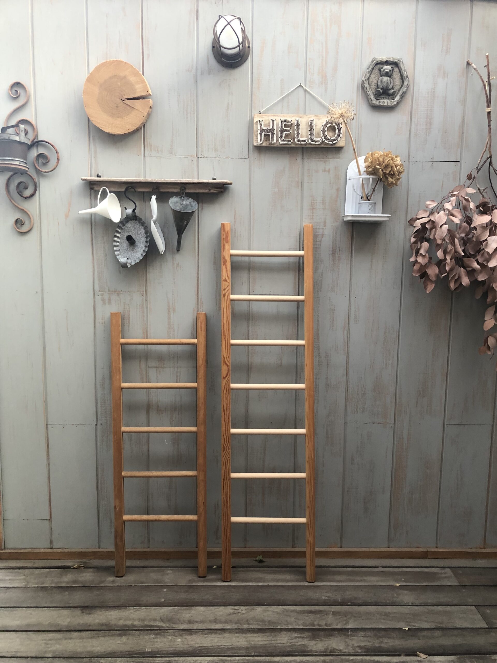 赤松の木材を面取りした長棒に、横桟を差し込みボンドで固定し組み立てます。軽いので吊るして飾っても素敵です。