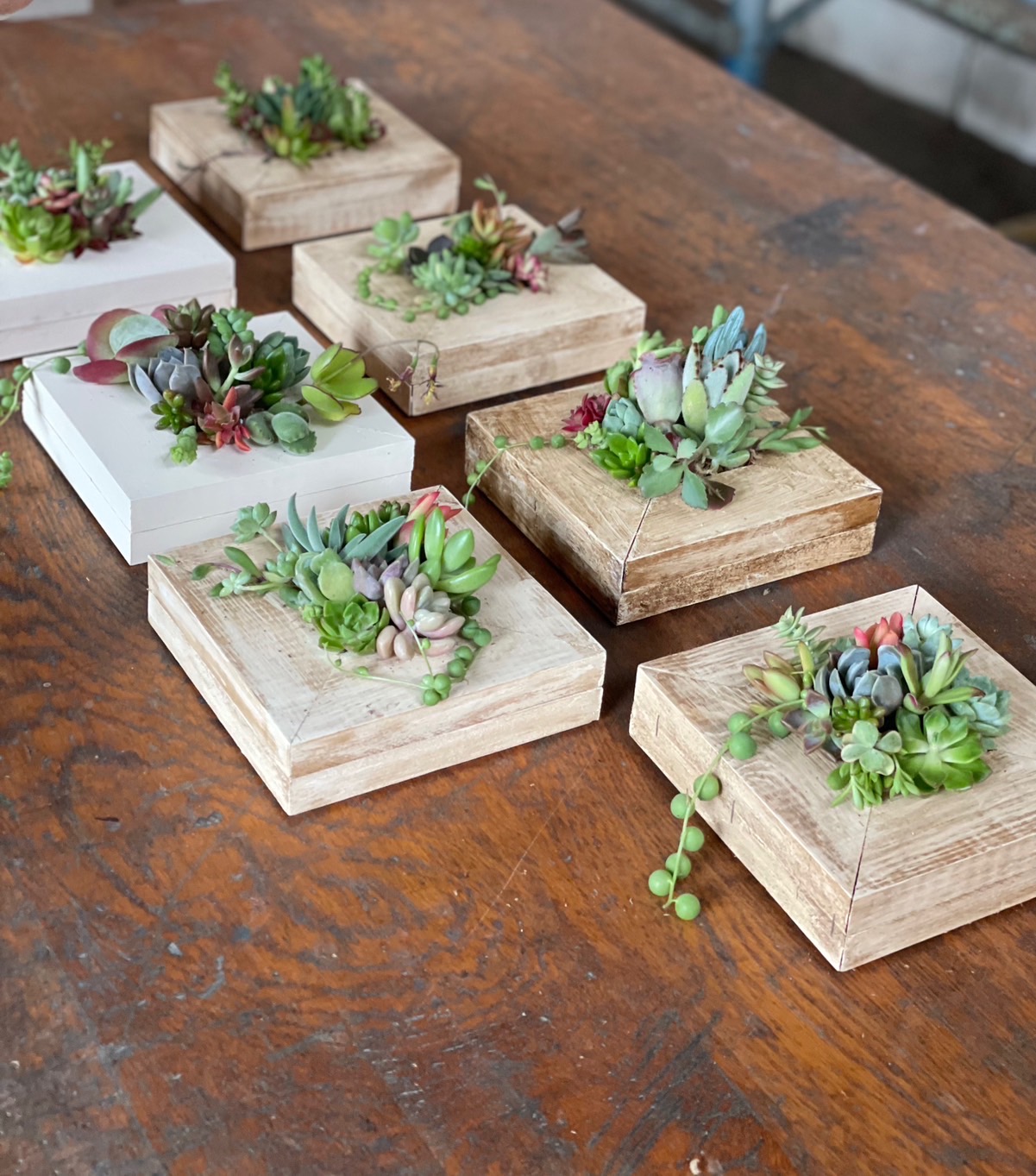 取っ手付きのBOXをつくりお好きな色にペイントします。多肉植物を寄せ植えします。