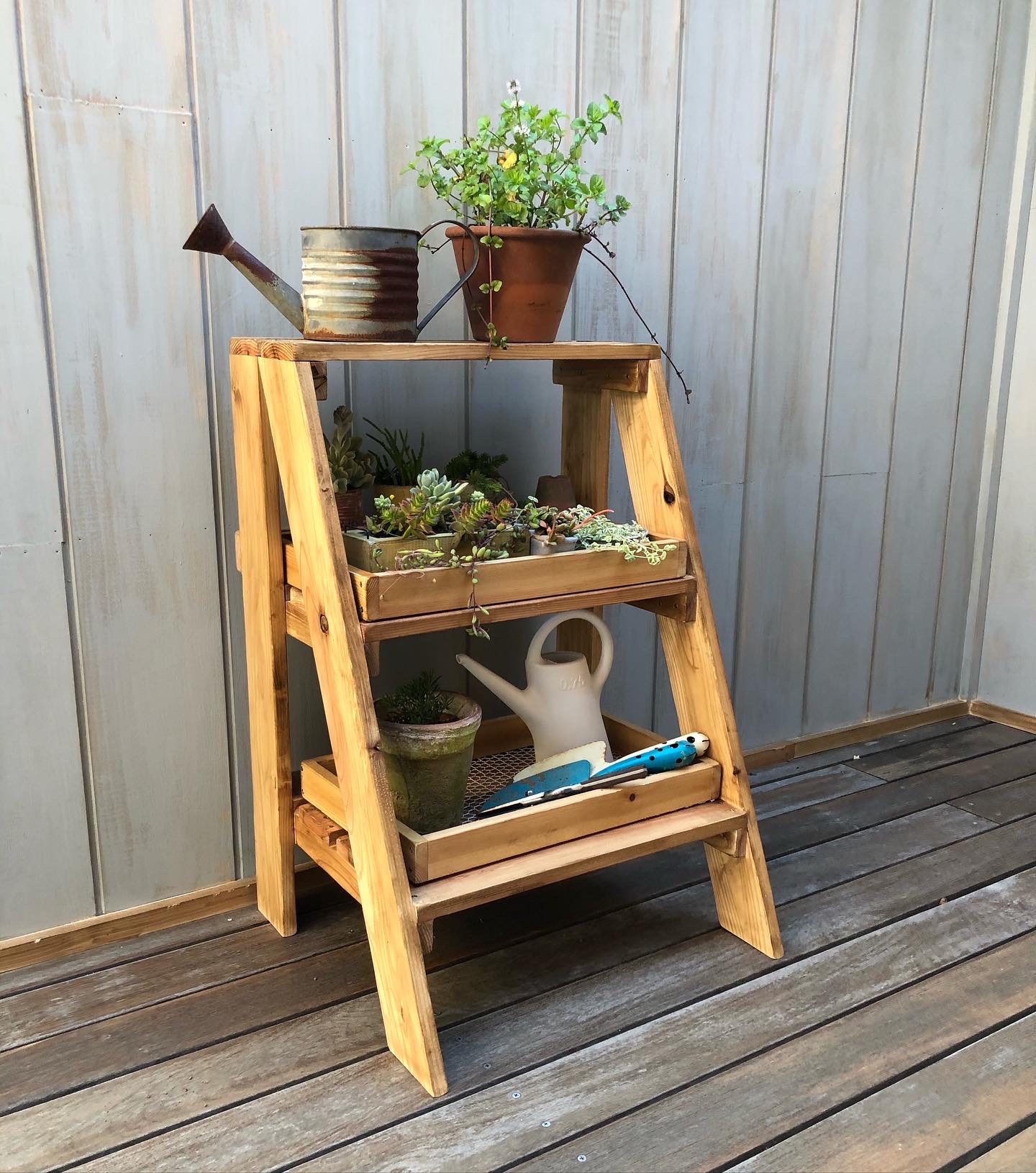 鉢植えのお花や多肉植物を飾ったり、下段には使わない鉢やシャベル、ハサミなど道具の収納に。