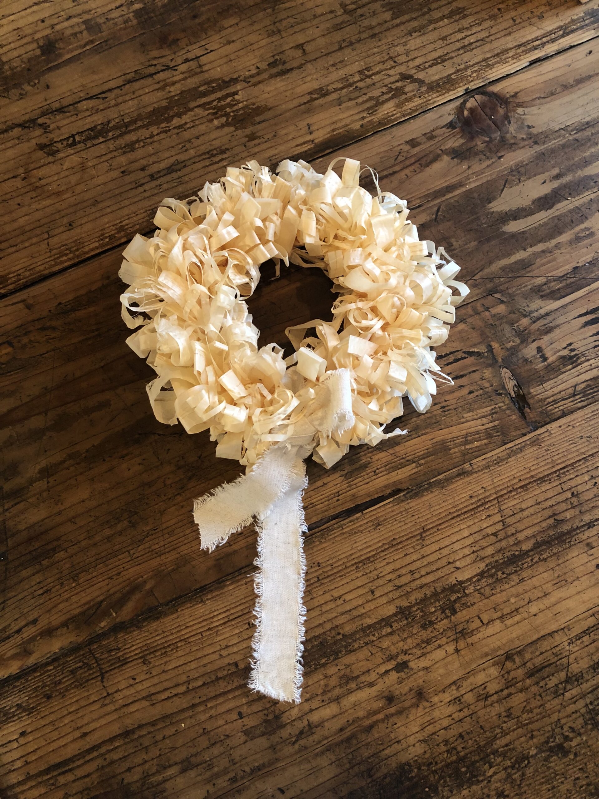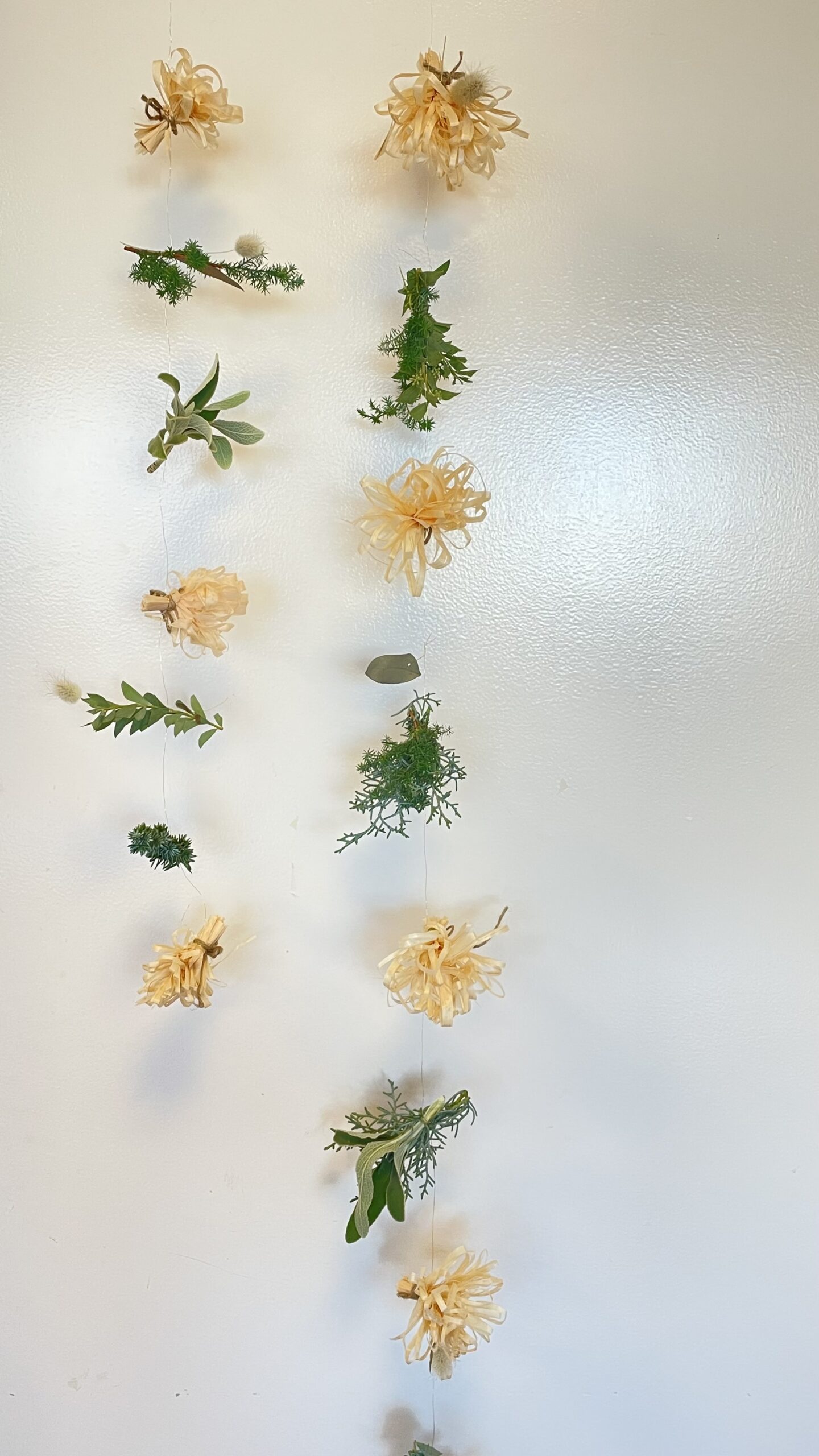 かんな屑でつくるフラワーとユーカリの葉やハーブをワイヤーでつないで作ります。